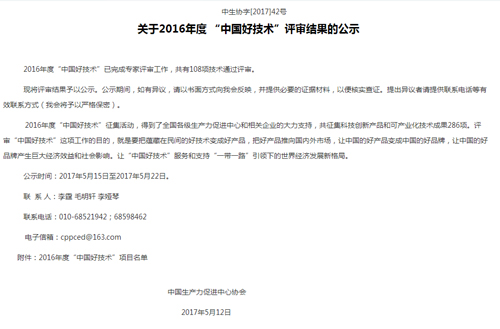 “中國好技術”是為深入貫徹落實黨中央、國務院關于實施創(chuàng)新驅動發(fā)展戰(zhàn)略和“大眾創(chuàng)業(yè)、萬眾創(chuàng)新”的精神,不斷激發(fā)全社會的創(chuàng)新創(chuàng)業(yè)活力,營造全民創(chuàng)新的良好氛圍,由中國生產(chǎn)力促進中心協(xié)會同國家相關機構和企業(yè)共同發(fā)起和舉辦的,此獎項評選為每年一次。在2016年度“中國好技術”征集中,得到了全國各級生產(chǎn)力促進中心和相關企業(yè)的大力支持,共征集科技創(chuàng)新產(chǎn)品和可產(chǎn)業(yè)化技術成果286項,獲得“中國好技術”稱號有108個項目。評審“中國好技術”這項工作的目的,就是要把蘊藏在民間的好技術變成好產(chǎn)品,把好產(chǎn)品推向國內(nèi)外市場,讓中國的好產(chǎn)品變成中國的好品牌,讓中國的好品牌產(chǎn)生巨大經(jīng)濟效益和社會影響。讓“中國好技術”服務和支持“一帶一路”引領下的世界經(jīng)濟發(fā)展新格局,讓“中國好技術”走出國門,走向世界。