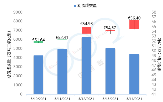 • 2021年5月10日至5月14日,由于歐盟碳市場投資者的強勢買盤以及歐盟氣候負責人對于歐盟碳價較為消極的干預政策,歐盟碳價在本周再次呈現較大漲幅并接連刷新記錄,由51.64歐元/噸上漲至56.40歐元/噸,漲幅達9.22%