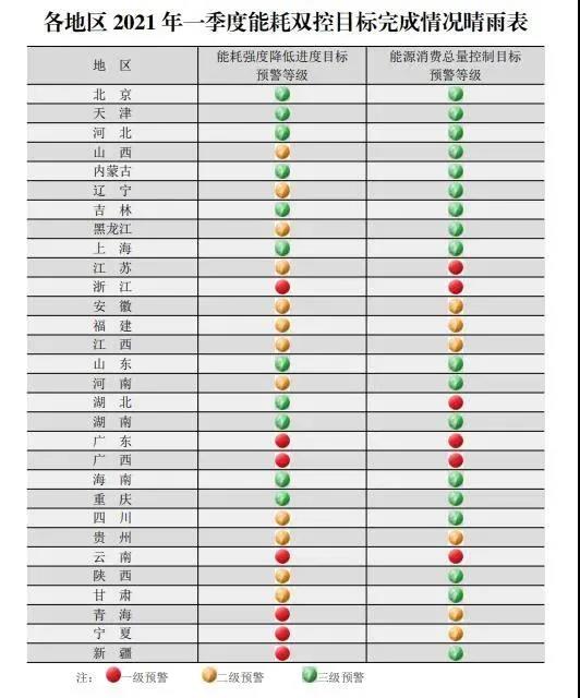為貫徹落實黨中央、國務院關于強化能源消費總量和強度雙控的決策部署,加強能耗雙控形勢分析預警,國家發展改革研究提出了《各地區2021年一季度能耗雙控目標完成情況晴雨表》。