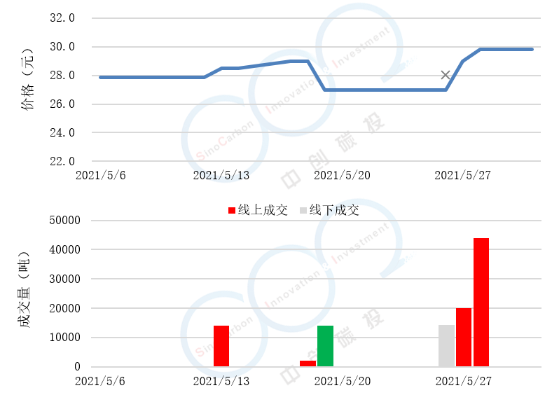• 線上成交價最低為27.00元,最高為29.80元,平均碳價為29.00元。