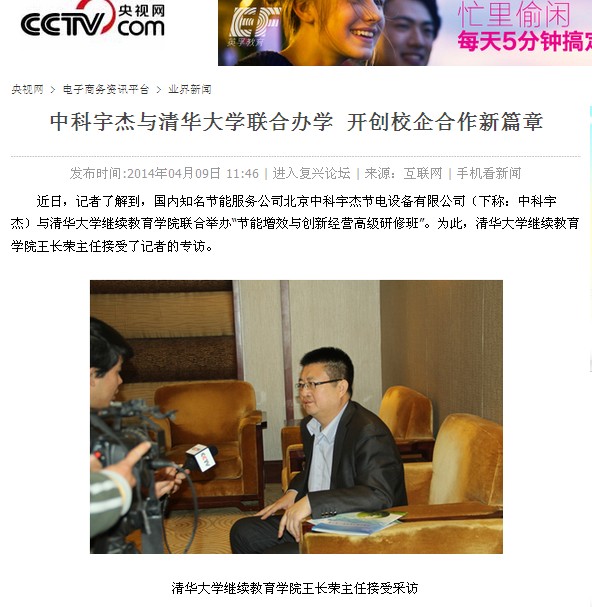 ????? 近日,記者了解到,國內知名節(jié)能服務公司北京中科宇杰節(jié)電設備有限公司(下稱:中科宇杰)與清華大學繼續(xù)教育學院聯(lián)合舉辦“節(jié)能增效與創(chuàng)新經營高級研修班”。為此,清華大學繼續(xù)教育學院王長榮主任接受了記者的專訪。