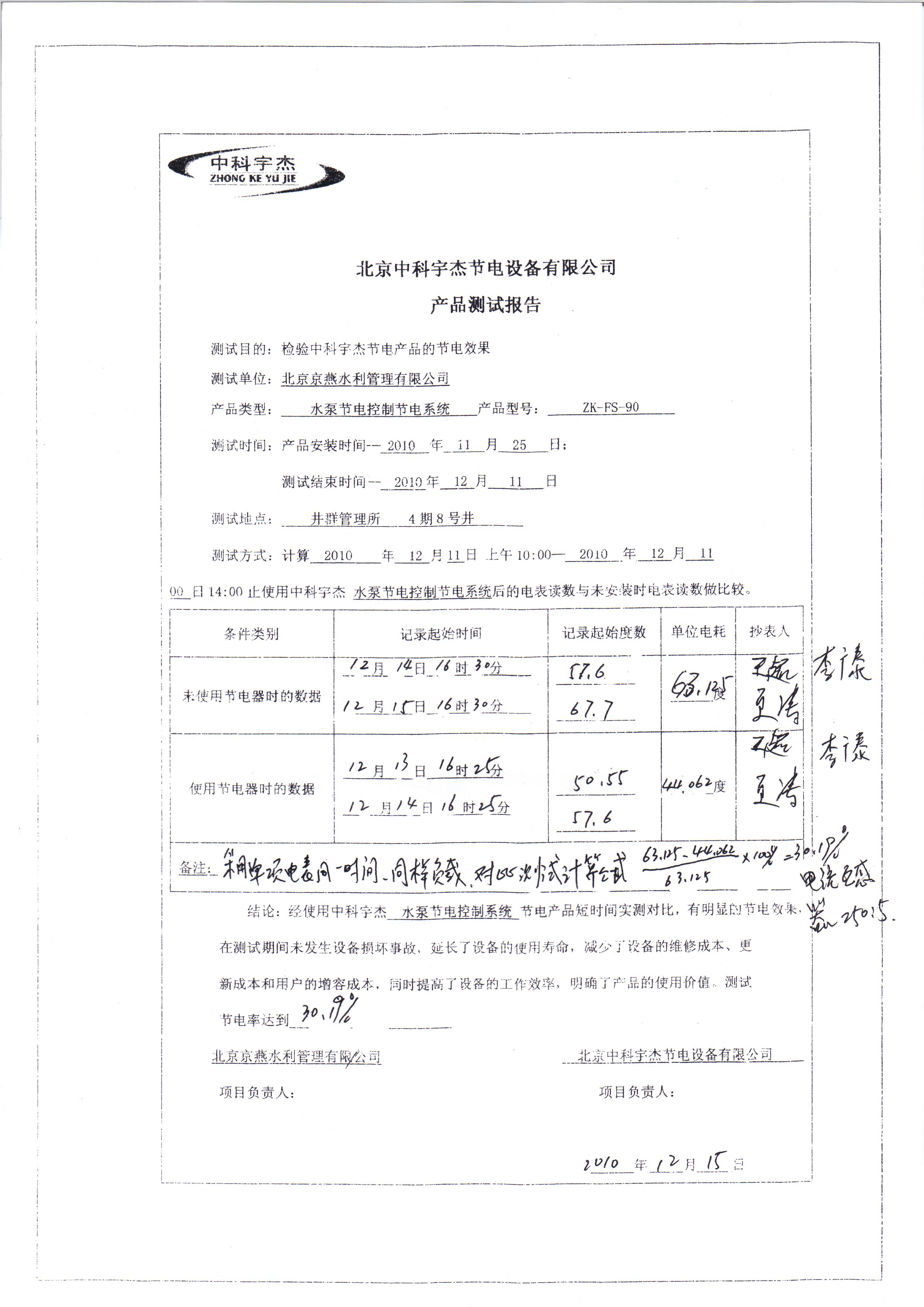 經安裝調試驗收,節能效率達到30%,投資回報期6個月,按質保十年計算,此項節能工程能為北京京燕水利管理有限公司帶來380萬人民幣以上的直接效益。